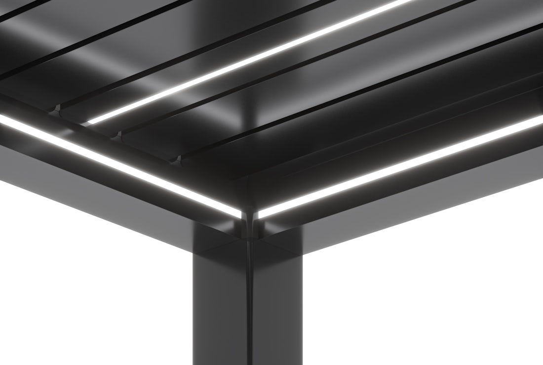 Discreet LED lighting, elegantly integrated into the louvres, casts a soft, adjustable glow—ideal for evening dips and creating a serene, resort-style ambiance.